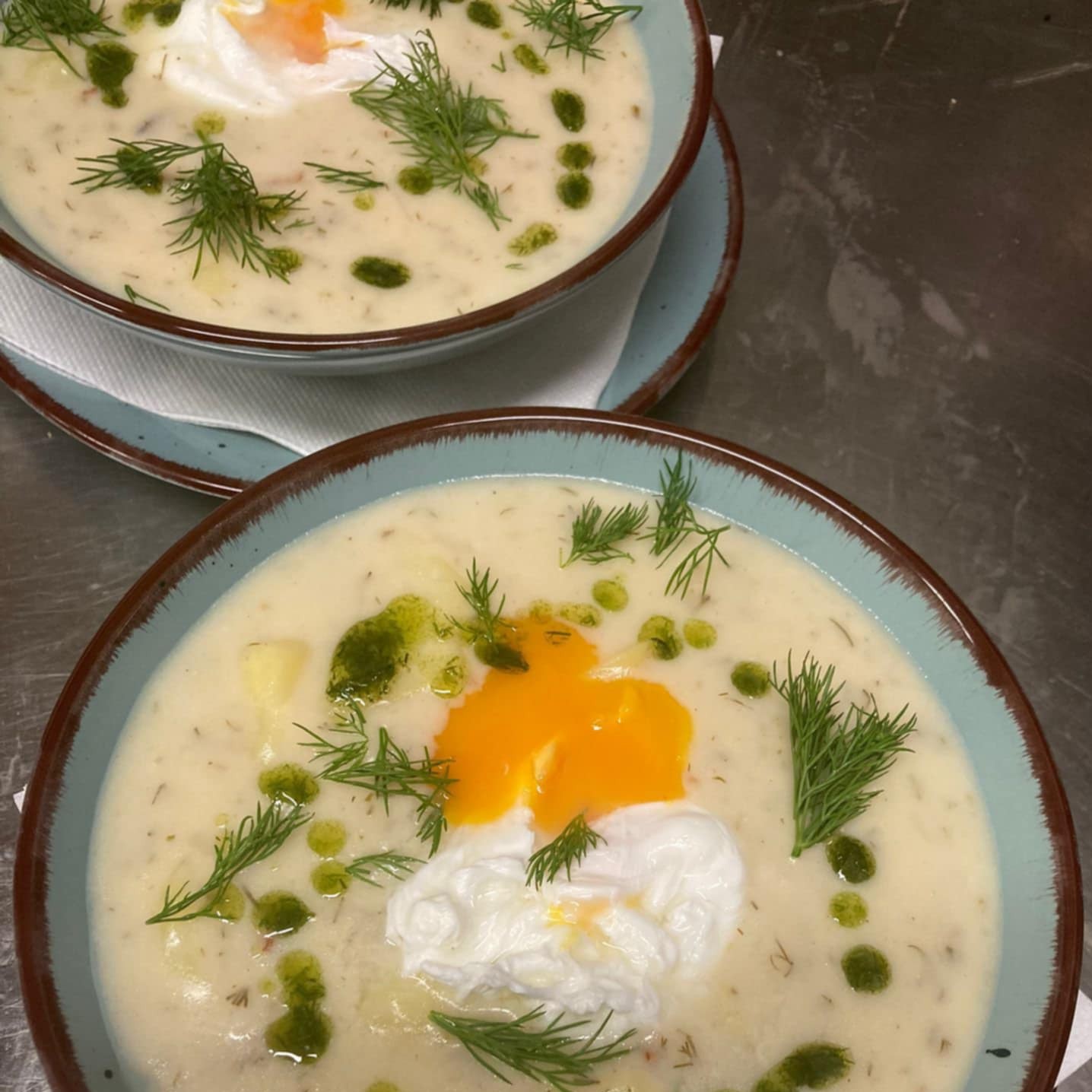 domácí kulajda s hříbky, smetanou, bramborem, zastřeným vejcem a čerstvým koprem (1,3,7)