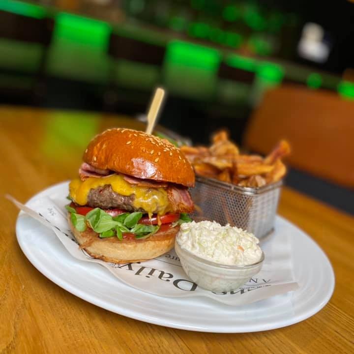 180g hovězího mletého masa v máslové housce s cibulovým chutney, vyzrálou goudou, anglickou slaninou, římským salátem, plátkem rajčete, okurkou, signature mayo, salátem coleslaw a holandskými hranolky (1,3,7)